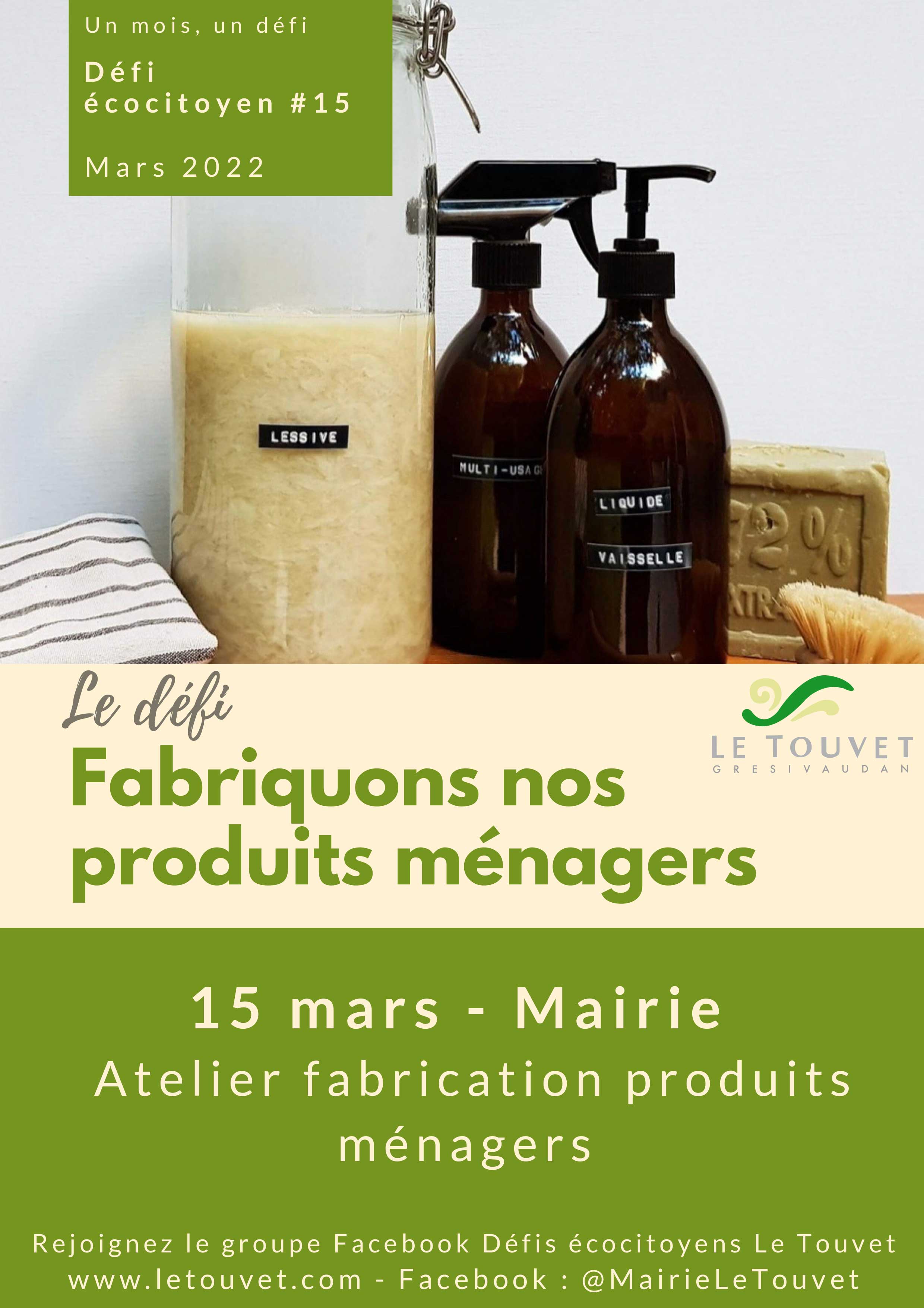 ![]() | mardi 15 mars 2022 de 18:30 à 20:00Défi écocitoyen #15 – Fabriquons nos produits ménagers |