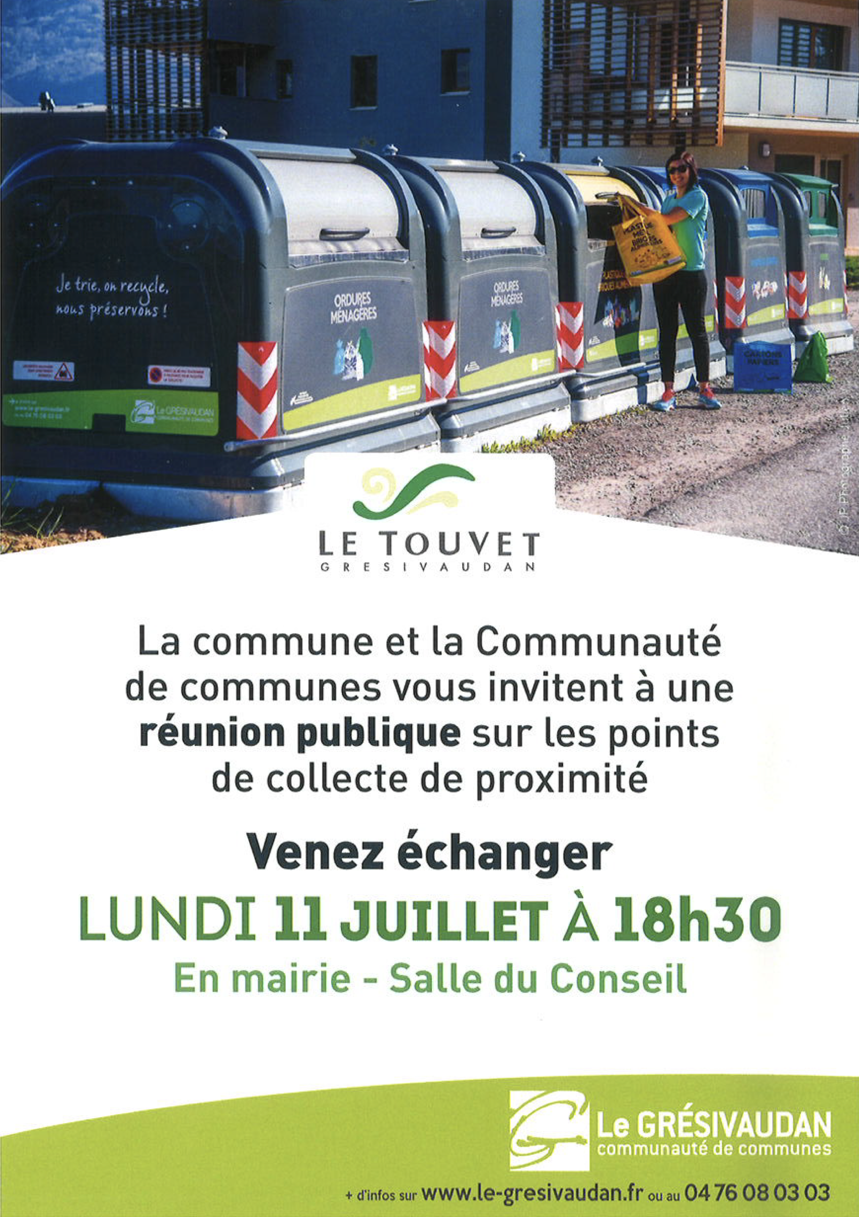 La Municipalité et la Communauté de Communes du Grésivaudan vous invitent à une réunion publique lundi 11 juillet à 18h30 à la mairie, pour évoquer ensemble les points de collecte de proximité mis en place sur la commune.